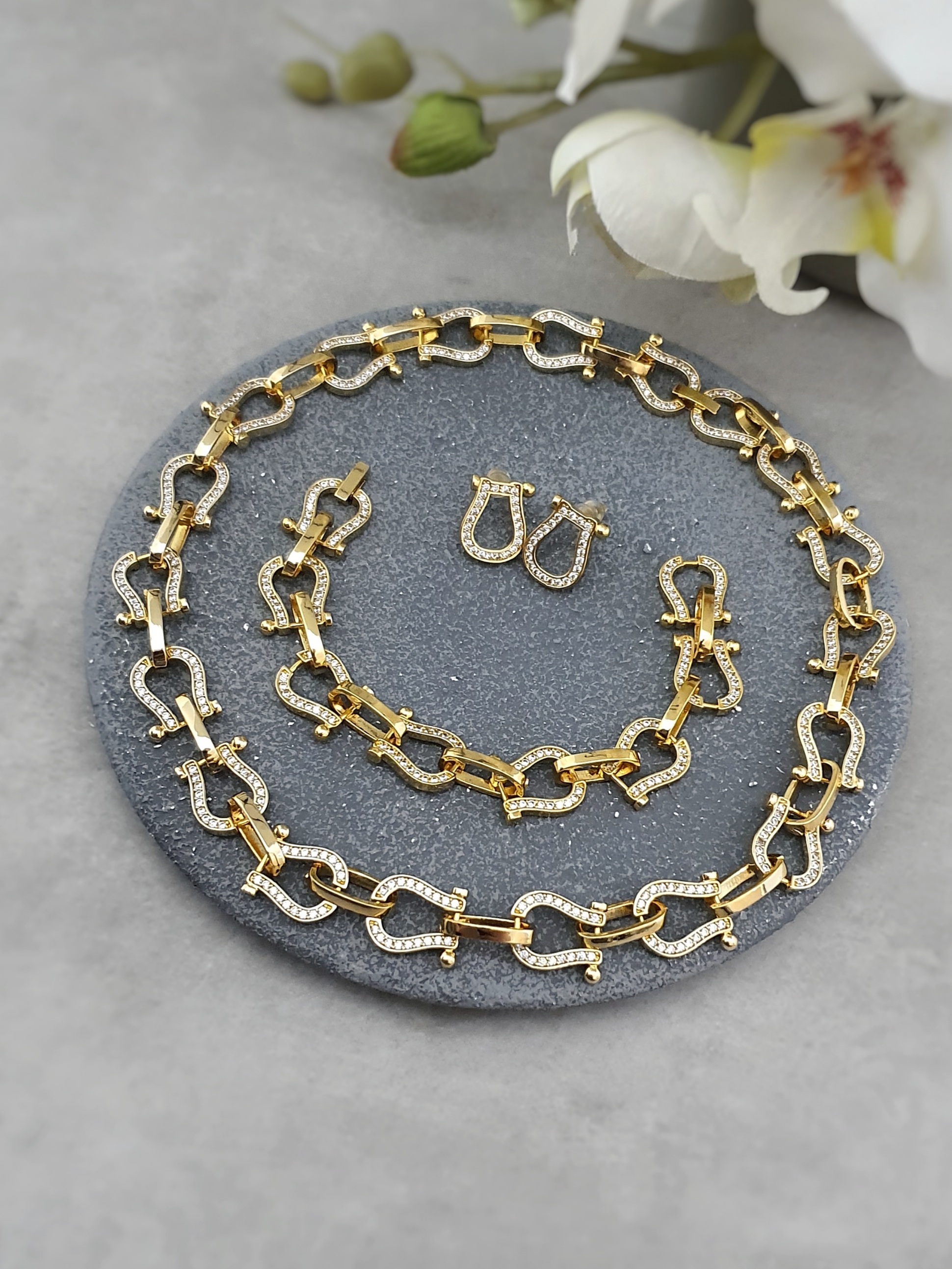 مشخصات اصلیرنگ / طلایی / نقره ایمشخصات فرعیطول گردنبند42سانتطول دستبند20سانتآبکاریرادیوم و طلا با روکش نانوجنس نگینزیرکونیم مخراج کاری شده